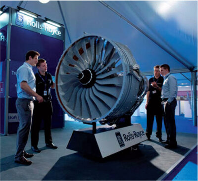 Figure appears to be a Rolls-Royce aircraft engine with engineers looking at it. Closer inspection indicates it is fabricated from lego.